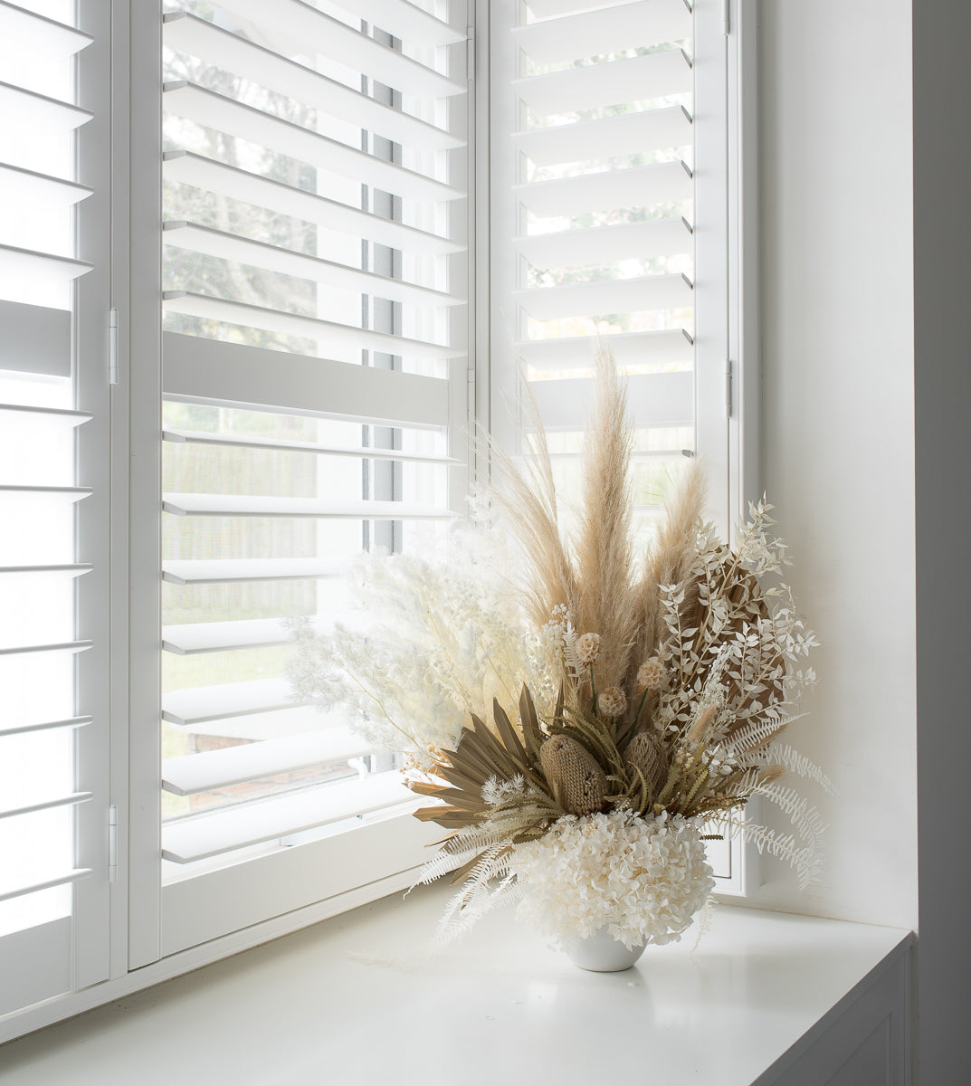 - Pampas, banksia, scabiosa pods, 3 different types of fern, bunny tails, baby breath and hydrangea