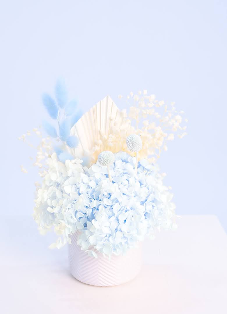 - A delightful arrangement featuring a delightful mix of pointy spear palms, voluminous hydrangea, soft babies breath, fluffy bunny tails and a burst of billy buttons.